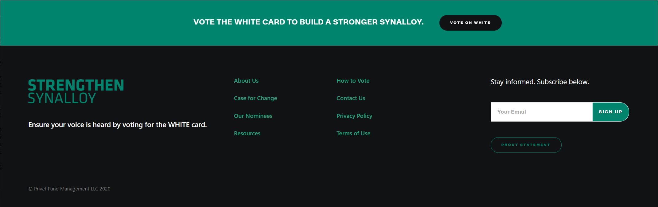 Item 1: On May 20, 2020, the Stockholder Group sent the following email to subscribers of www.StrengthenSynalloy.com:
