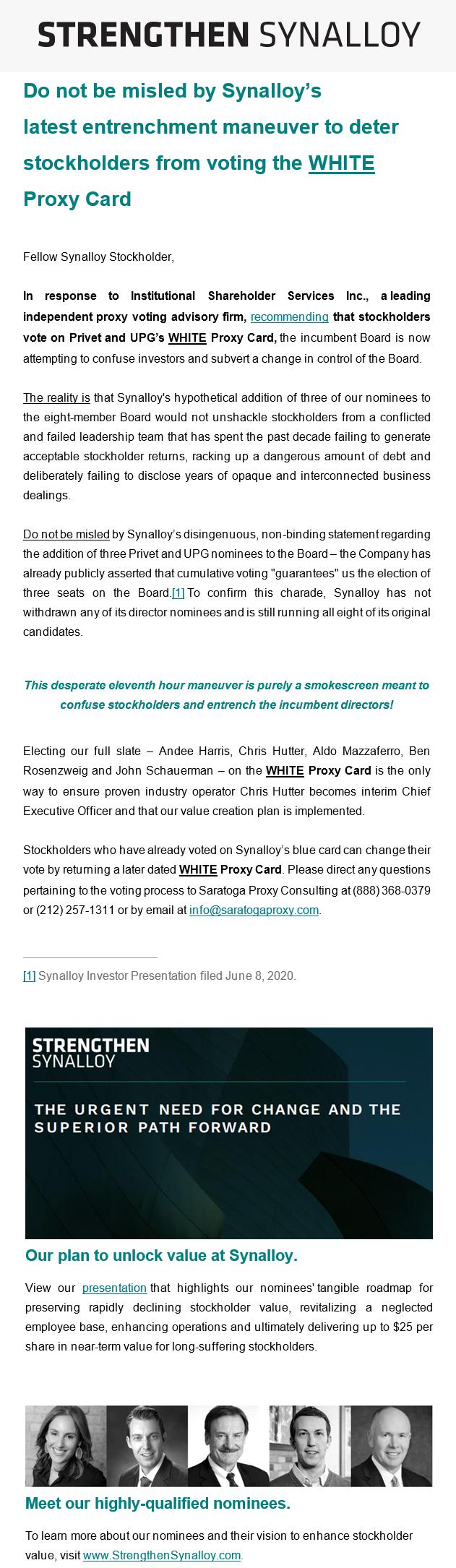 Item 2: On June 18, 2020, the Stockholder Group sent the following email to subscribers of www.StrengthenSynalloy.com.