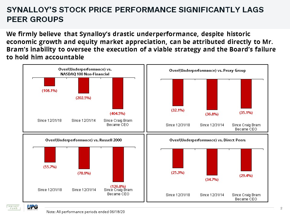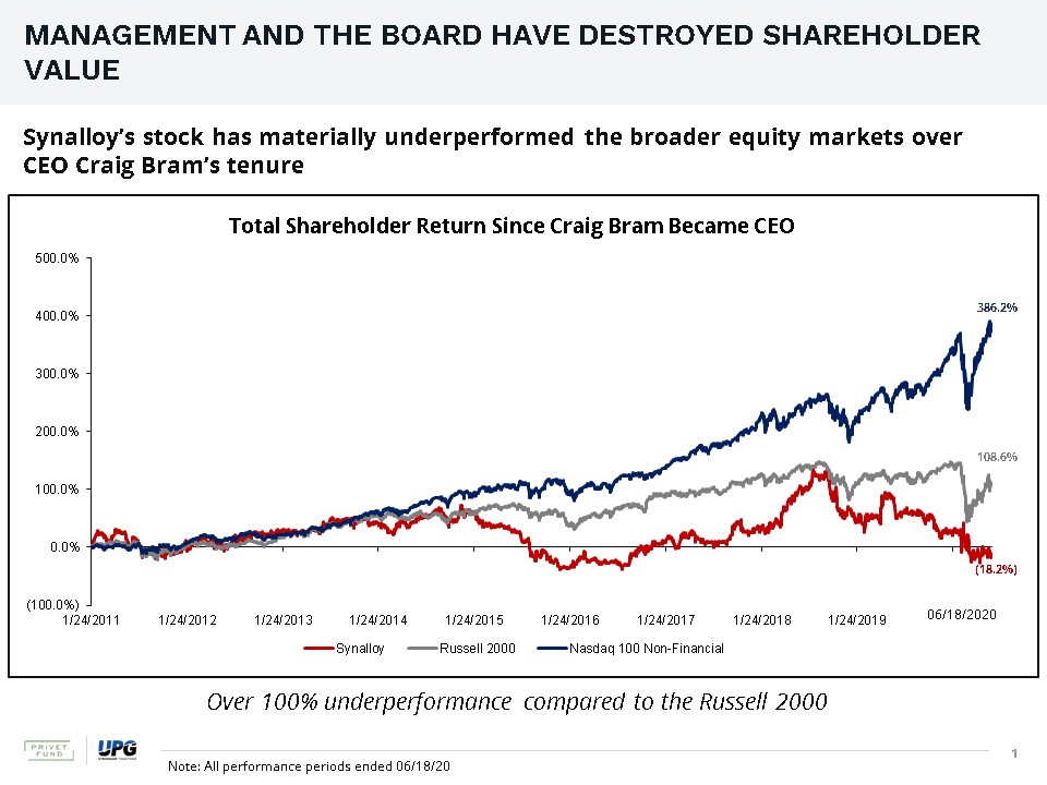 Privet Fund Management LLC (together with its affiliates, “Privet”) and UPG Enterprises LLC (together with its affiliates, “UPG”, and collectively with Privet, the “Stockholder Group” or “we” or “us”) are the largest stockholders of Synalloy Corporation (“Synalloy” or the “Company”), with aggregate ownership of approximately 24.9% of the Company’s outstanding common stock. We have nominated five highly-qualified individuals for election to Synalloy’s eight-member Board of Directors (the “Board”) at the Annual Meeting of Stockholders (the “Annual Meeting”) scheduled to be held on June 30, 2020. By doing so, we are offering long-suffering stockholders the opportunity to finally unshackle themselves from a failed leadership team that has spent the past decade delivering indefensible underperformance, racking up a dangerous amount of debt and deliberately failing to disclose decades of side business dealings.